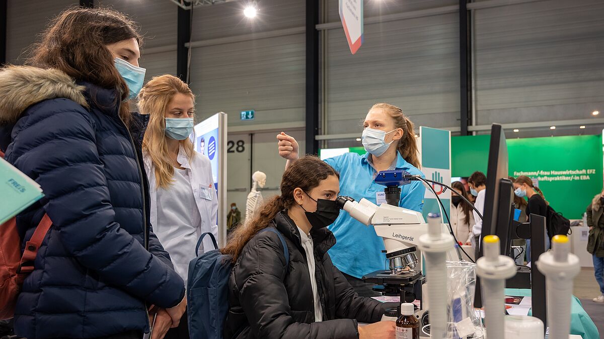 Fachpersonen aus Zentralschweizer Betrieben waren vor Ort und geben Einblicke in Ihre Berufe. Interessierte konnten an Erlebnisposten erste "Arbeitsversuche" starten. Zum Beispiel einen Wundverband wechseln, Umlagern, Bakterien unter dem Mikroskop untersuchen, Hände "röntgen" und vieles mehr.